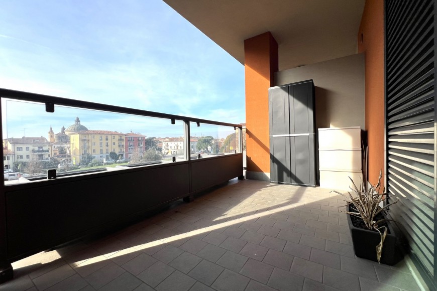 In una tranquilla zona residenziale, a pochi passi dai principali servizi, si trova questo delizioso Trilocale con tre terrazzi e tripla esposizione solare. L'immobile, di recente costruzione, si distingue per la luminosità, le ottime finiture e la classe energetica elevata, che garantisce costi di gestione contenuti. L'appartamento, situato al secondo piano con ascensore, offre una zona living in open-space con affaccio sul terrazzo abitabile da cui si gode di una vista aperta sulla Basilica di Madonna di Campagna, una spaziosa camera da letto matrimoniale, una camera singola, un moderno bagno con box doccia ed il secondo bagno ad uso lavanderia. Entrambe le camere si affacciano su un secondo terrazzino abitabile. Completano la proprietà una pratica cantina e due garages affiancati e comunicanti per parcheggiare comodamente due auto, rendendo questa soluzione abitativa ancora più attraente. Questo Trilocale rappresenta un'opportunità da non perdere per chi desidera vivere in un ambiente confortevole e ben curato. L'arredamento raffigurato nelle fotografie è compreso nel prezzo richiesto. Disponibilità immediata, maggiori informazioni previo appuntamento.